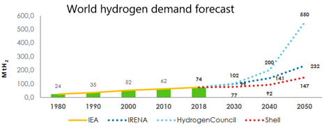 All the forecasts point to a growth in global hydrogen demand in the medium (2030) and long term (2050), but with significant differences between sources: no one can anticipate its future exactly due to complex market dynamics, such as the appearance of new uses and consumption models.