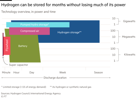 Hydrogen storage can perform this function. Between 2050 and 2070, hydrogen with up to two weeks of stored energy is expected to provide a cost-effective storage method, depending on the capital costs of power and electricity capacity.