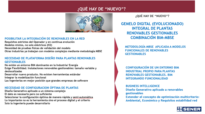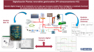 El desarrollo pretende crear un gemelo digital integral de generación renovables gestionables, un producto único y nuevo que debe adaptarse a cada tamaño y tipología de Planta. Combina la metodología BIM industrial de construcción con la ingeniería basada en modelos.